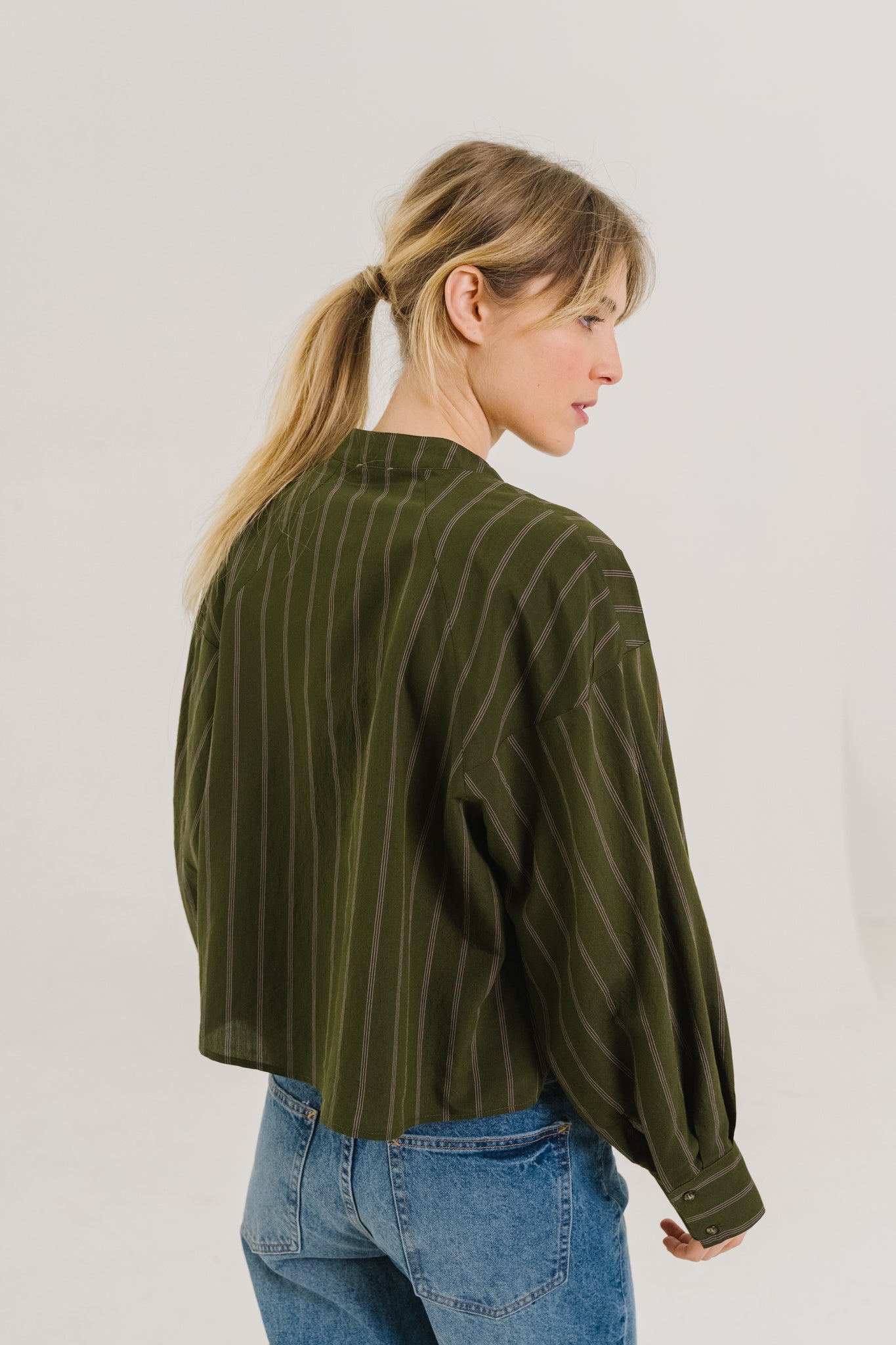 Short khaki blouse with thin pink stripes, made of fluid viscose. Its loose raglan sleeves, tightened by a pleat at the bottom of the sleeve, give it volume while being light. Featuring a mandarin collar and hidden buttoning, it has a feminine and elegant style that is easy to wear every day.