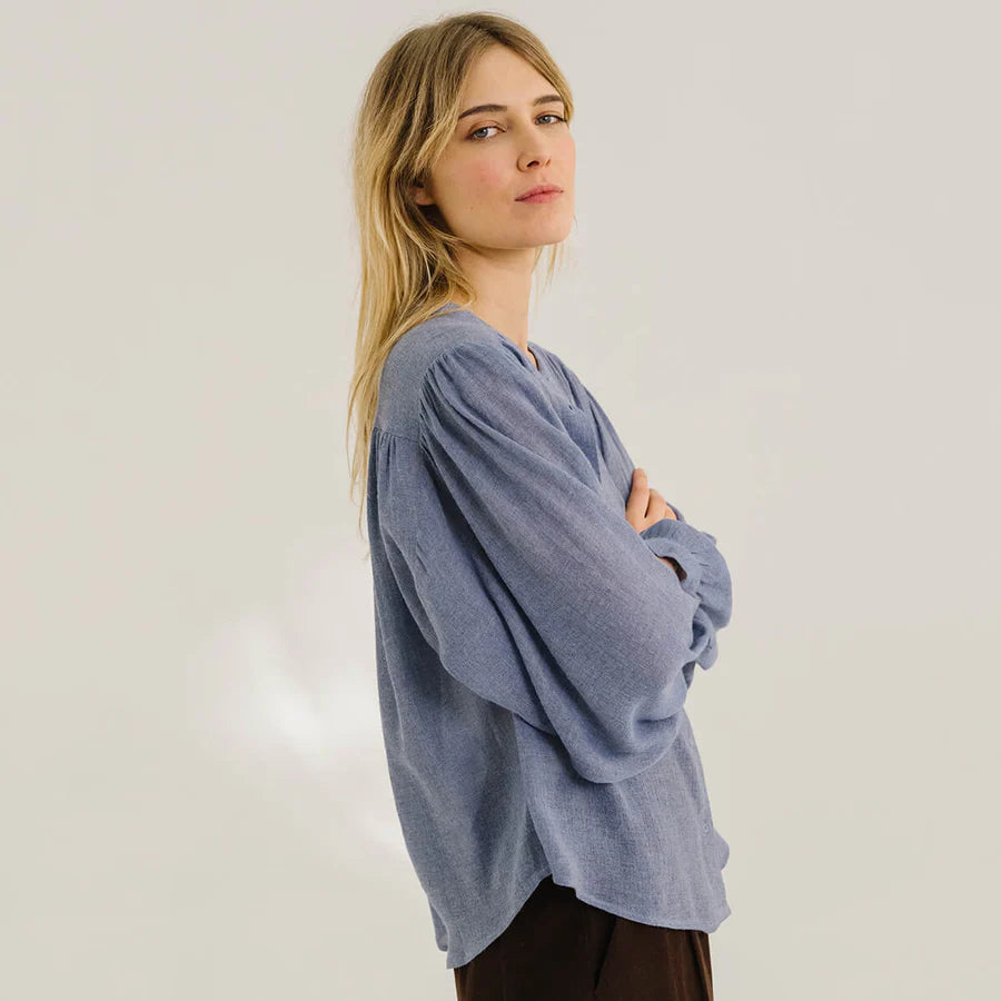 Plain long-sleeved blouse made from a blend of viscose and indigo wool. Its loose, flowing cut is highlighted by a thin mandarin collar and gathers at the front, back and bottom of the sleeves. The slightly puffed sleeves bring lightness and elegance to the silhouette, while the buttoned cuffs sign a delicate finish.