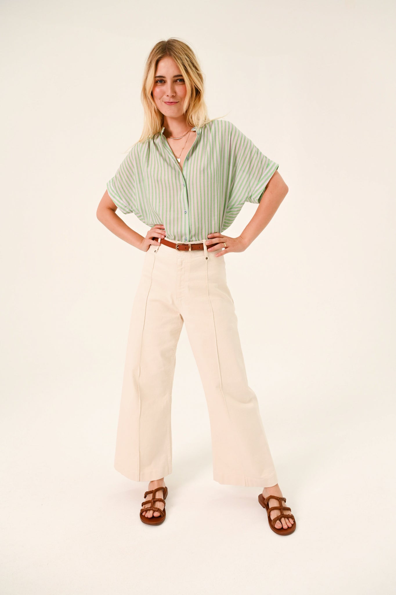 This short-sleeved blouse features a vibrant multicolored striped pattern. The relaxed, fluid cut is detailed with gathering at the shoulders and back, creating a silhouette that is both airy and structured. Finished with a slim Mandarin collar, an exposed button front, and rolled cuffs, it offers a look that is both modern and elegant.